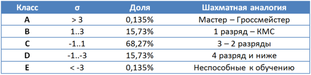 Если допустить, что сотрудники класса C (средние) находятся между двумя стандартными отклонениями (разделенными медианой) при нормальном распределении, и каждый класс занимает 2 стандартных отклонения, то можно получить такую таблицу: