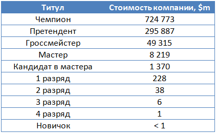 Такую шахматную аналогию я провел для организаций относительно их стоимости. За титул чемпиона я взял стоимость компании Apple, далее логарифмическим шагом провел разделение между разрядами. Чемпиона и претендента отделил на полшага. Таблица весьма условная, тем не менее, мы будем использовать её как некий ориентир для сравнения компаний относительно их стоимости.